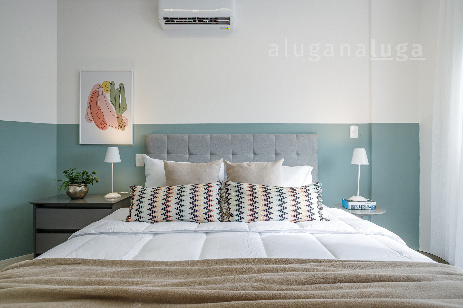 Suite avec lit queen-size et Smart TV pour plus de confort et de divertissement. Deuxième chambre décorée avec élégance. Salon spacieux et moderne avec canapé-lit et Smart TV. Cuisine entièrement équipée avec des ustensiles et des appareils neufs. Salle de bain avec douche en verre et commodités essentielles. Espace bureau dans le salon avec internet haut débit — idéal pour le télétravail. Climatisation dans toutes les pièces pour un confort optimal toute l’année.