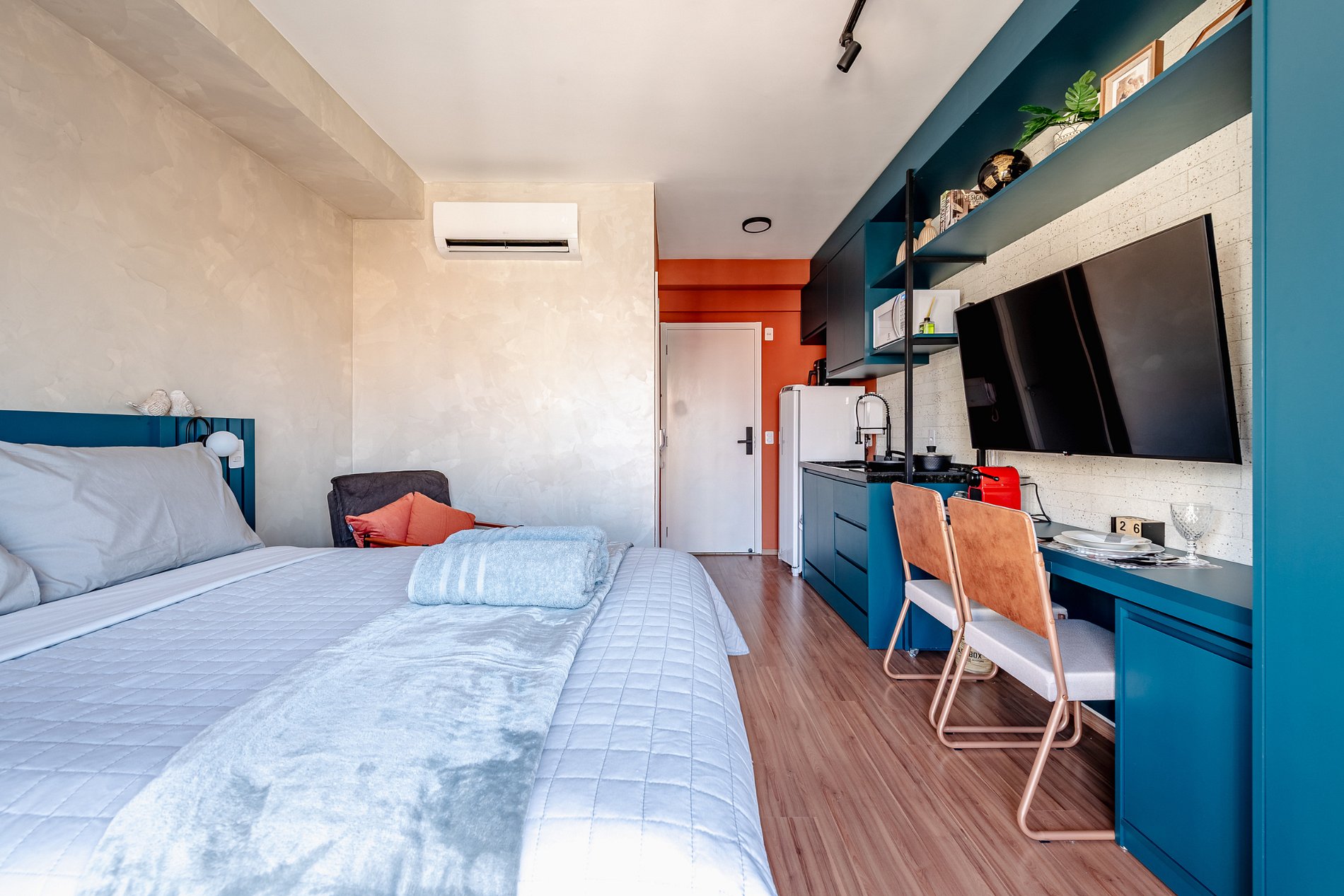 O layout inteligente aproveita cada metro de forma funcional, criando um ambiente prático, confortável e agradável. A atmosfera é moderna e equilibrada, ideal tanto para descanso quanto para momentos de foco. O studio atende perfeitamente quem busca praticidade, conforto e uma experiência urbana bem organizada, sem excessos e com tudo no lugar certo.
