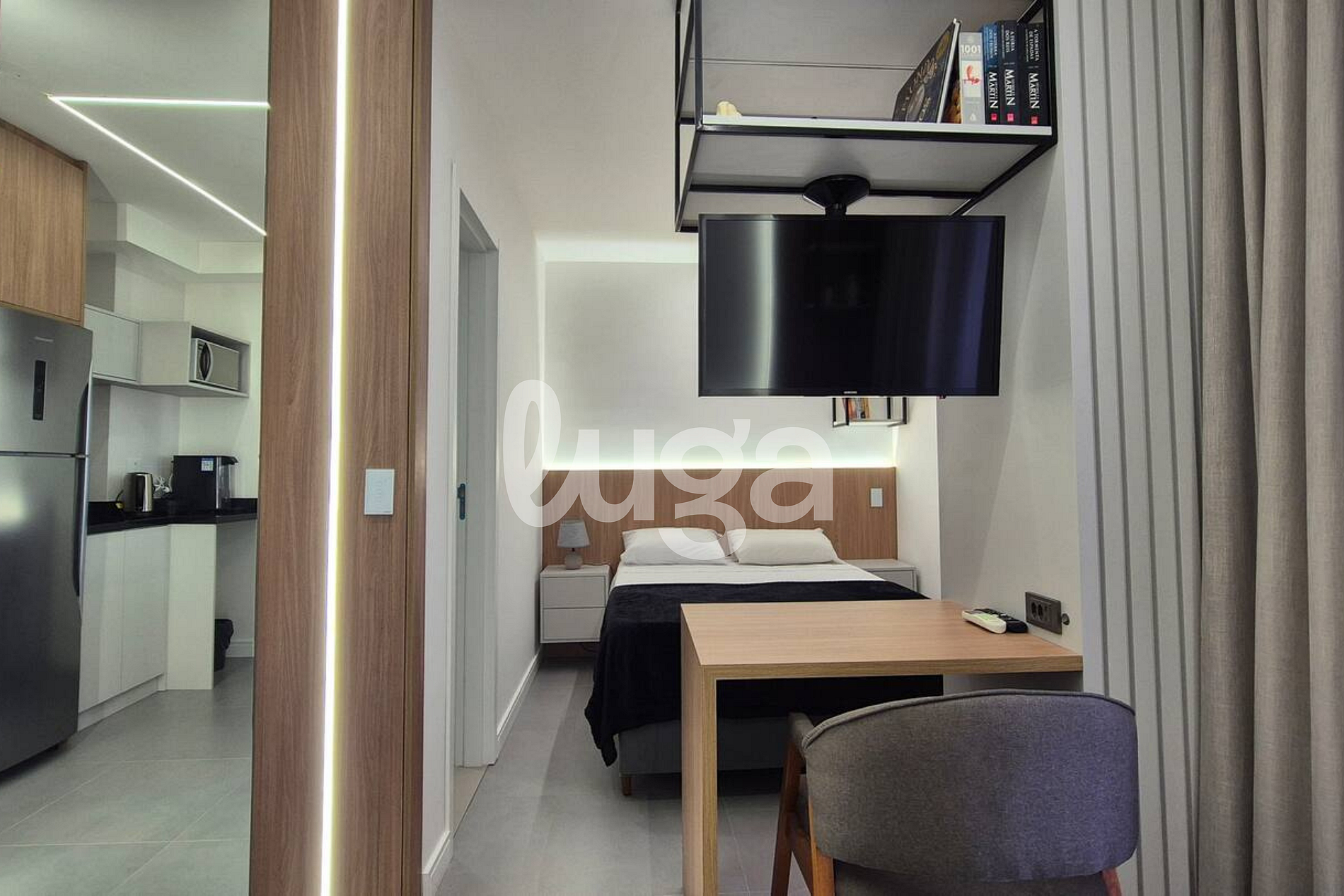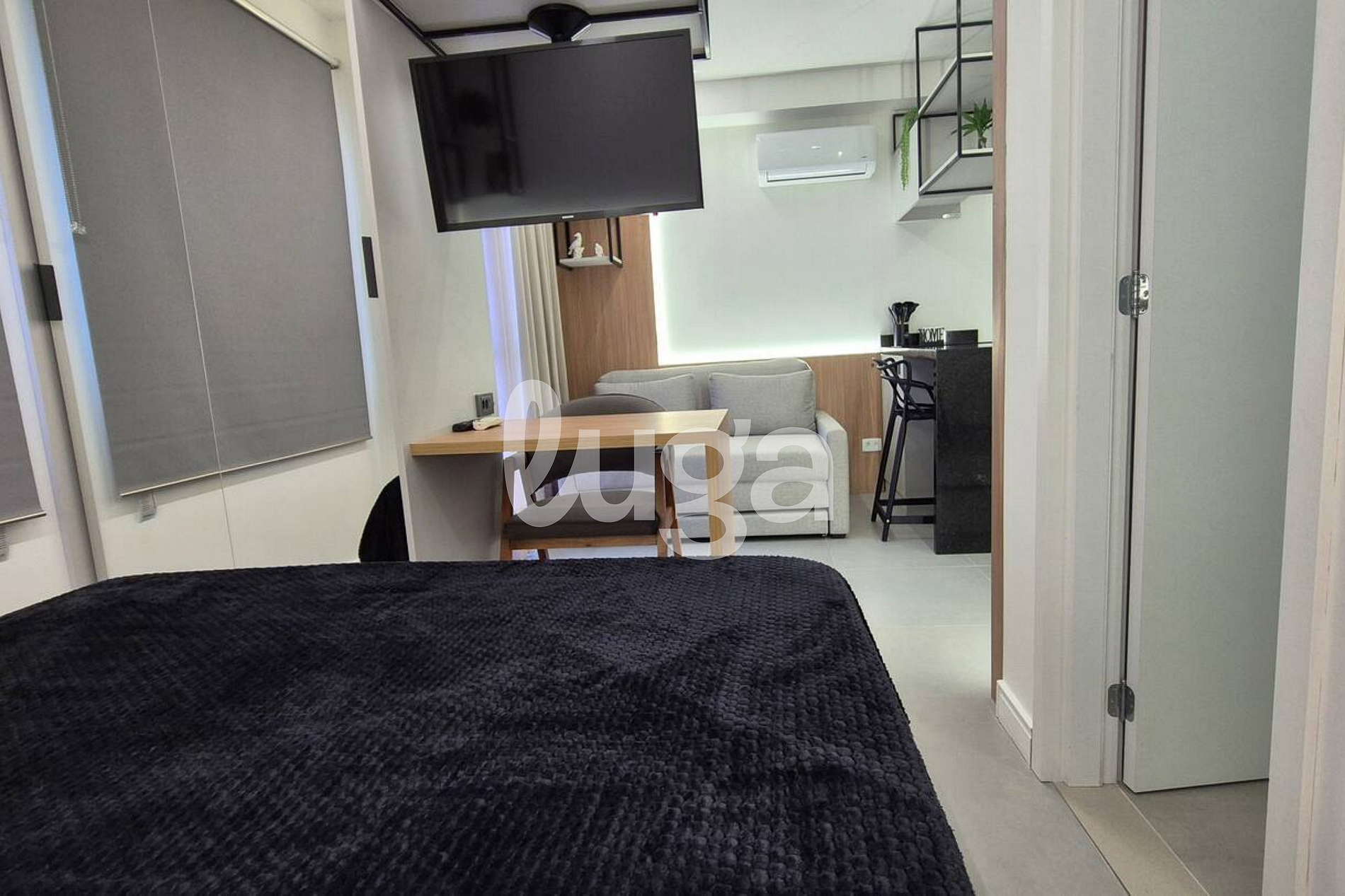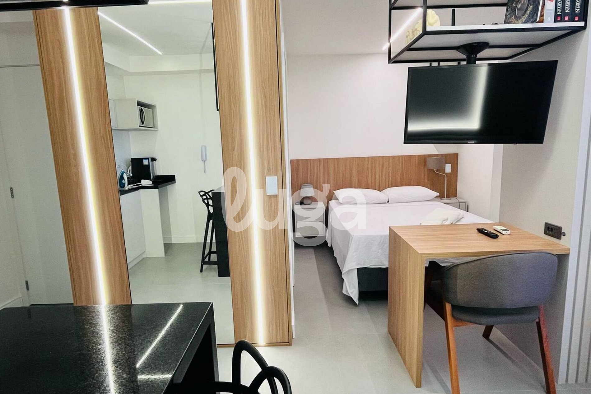Nosso apartamento é um espaço acolhedor e funcional, novo, todo planejado e decorado com extremo bom gosto. Pensado para o seu conforto, ele conta com uma aconchegante área que integra a cozinha completa e uma cama de casal, proporcionando praticidade. A sala com TV foi inteligentemente desenhada para que a tela possa ser girada e assistida tanto da cama quanto da sala, garantindo entretenimento em qualquer ambiente. É o lugar perfeito para relaxar e sentir-se em casa.